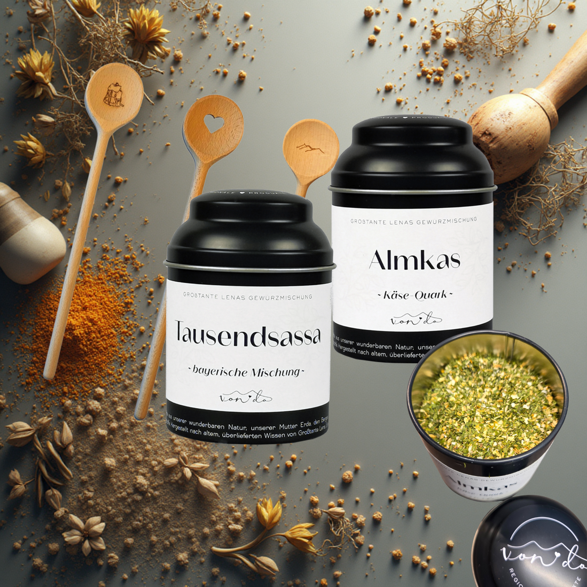 Dieses Set vereint alles, was eine echte Alpenküche ausmacht:  Unsere Lieblinge, zwei hochwertige Gewürzmischungen und ein liebevoll gravierter Holzlöffel – praktisch, natürlich und voller Heimatgefühl.